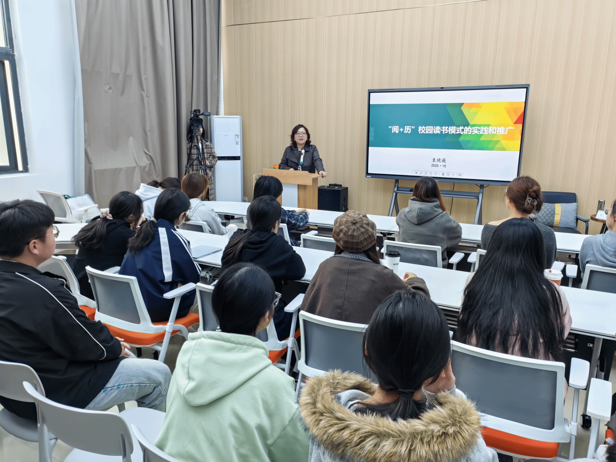 活动伊始,主持人简要介绍了袁晓薇教授的学术背景与丰富经历,强调了掌握科学读书方法对于大学生成长成才的重要性,为整场讲座奠定了浓厚的学术氛围。随后,袁教授围绕"'阅+历'校园读书模式的探索、实践、应用及所产生的品牌效应"展开深入阐述,鼓励同学们不仅要注重知识的内化吸收,更要善于将所学转化为述作输出。她积极倡导跨学科阅读,引导同学们主动建构自己的知识框架,并寄语大家"更多努力去体验、去创造、去行动"。