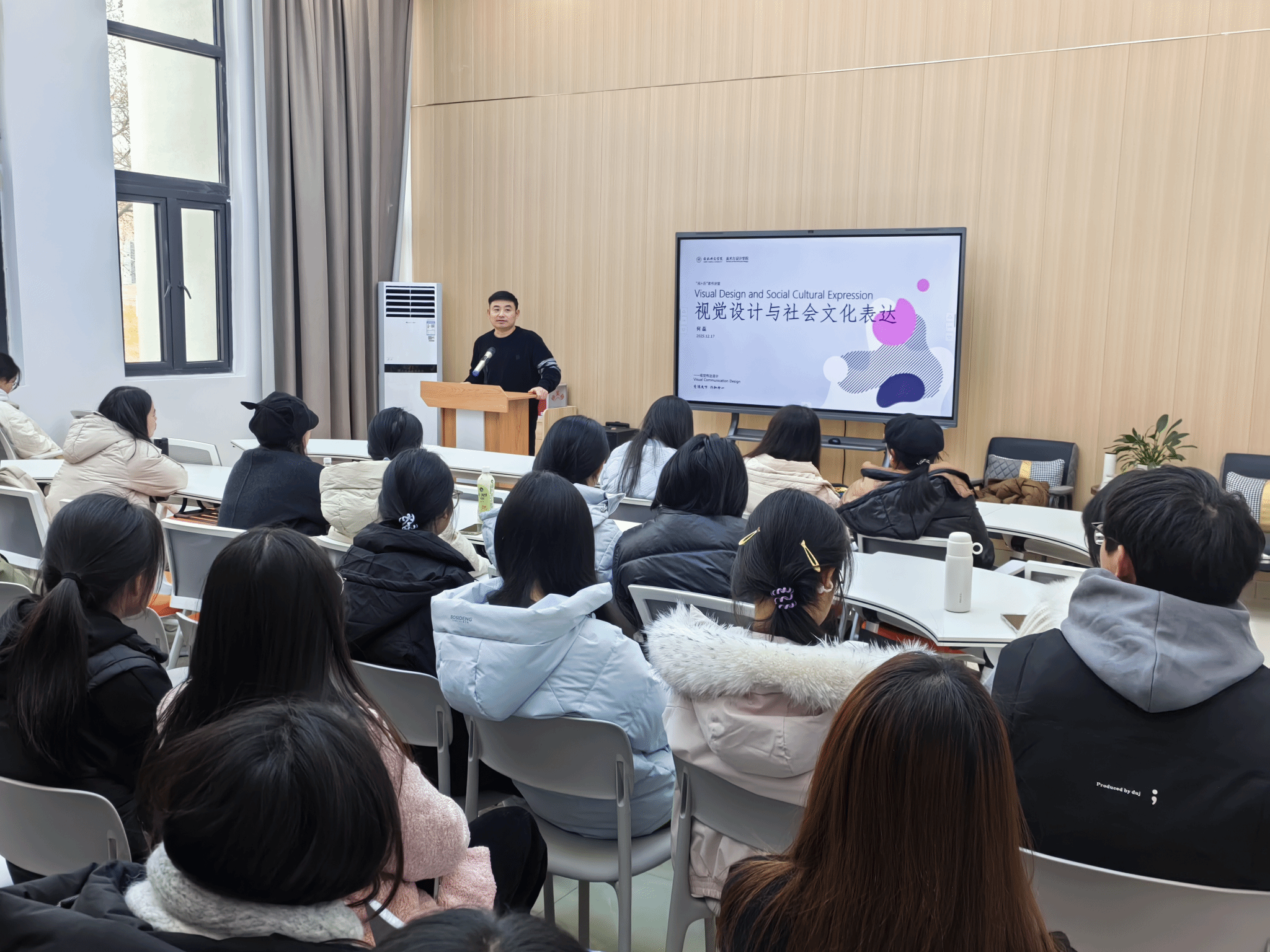开课后,何磊教授围绕“探讨视觉传达如何通过图像、色彩、符号等元素承载文化内涵、传递社会价值。结合理论与研究内容,展示视觉语言在文化传承、社会教化与情感表达中的重要作用,为人文学科提供跨学科视角与实践启示。”循序展开今天的主题讲演。何教授通过多个实验案例展示视觉设计在个体表达、社会议题呈现、跨文化传播及传统文化创新中的应用。讲座还将讨论视觉设计能力的培养方向,强调问题意识、批判性思维与审美提升的重要性,为同学们提供理论与实践结合的深入视角。