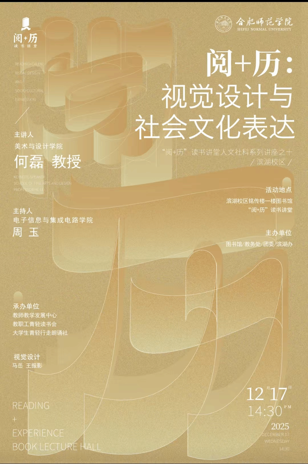 学期临近结束,滨湖校区“阅+历”读书讲堂继续践行初心,进一步丰富学院通识选修课程体系与教学组织模式,第十讲如期开讲。本次邀请的主讲嘉宾是美术与设计学院设计学博士、硕士生导师,安徽省高层次拔尖人才、江淮文化名家领军人才何磊教授,演讲主题是《视觉传达设计与社会文化表达》。全体课程选修学生及相关工作人员参与。